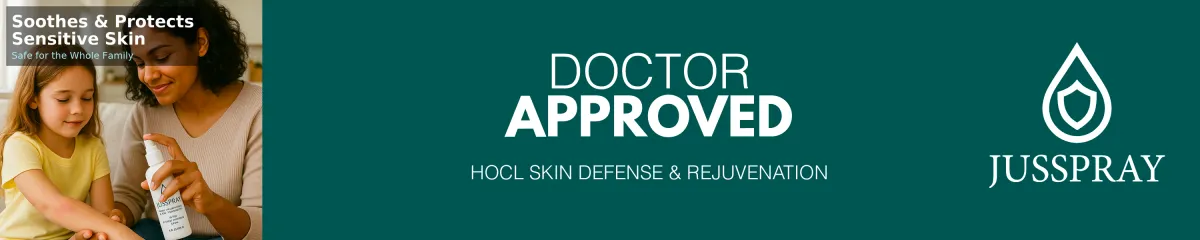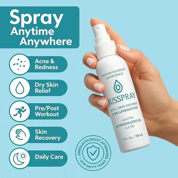 JUSSPRAY™ is a doctor-approved skin defense mist powered by Hypochlorous Acid (HOCl) — a molecule naturally produced by your body to fight bacteria, reduce inflammation, and support healing. It’s a gentle, multi-use solution for acne, redness, irritation, and everyday skin balance.